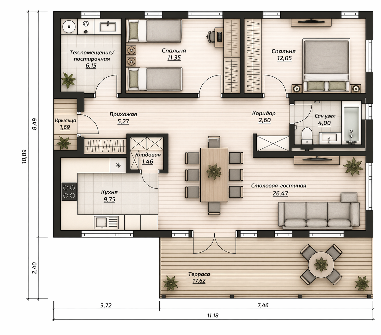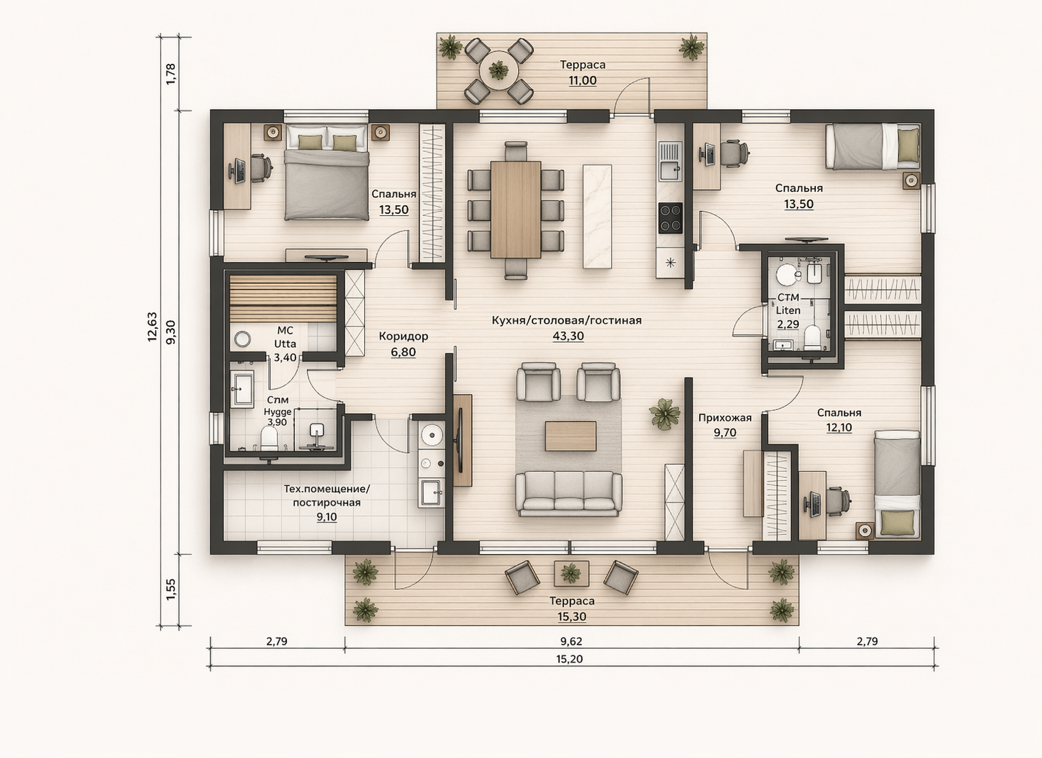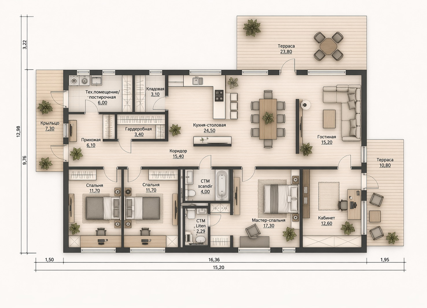- Основное утепление наружных стен — каменная вата 150 мм (опционально доступно +50 мм)